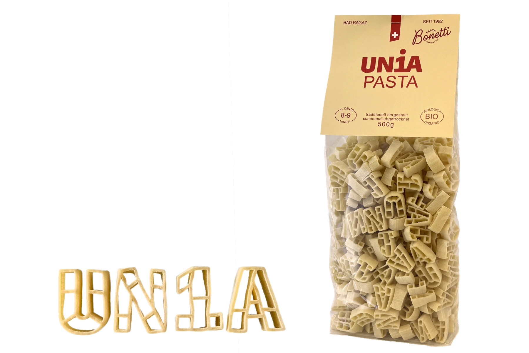 Die Teigwaren sind aus 100% Hartweizengriess bio und werden in einer Teigwarenmanufaktur in der Schweiz zu Motivteigwaren verarbeitet.